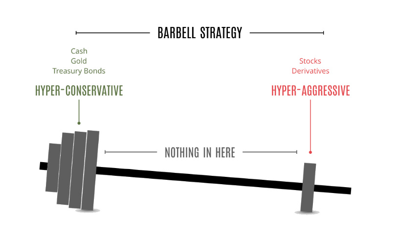 La estrategia Barbell la define muy bien Nassim Taleb en su libro "Antifrágil". Sería en la vida, el equivalente a casarse con un contable y tener una aventura ocasional con una estrella de rock.